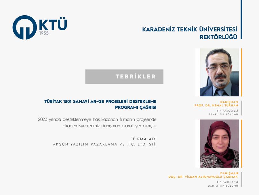 Akgün Yazılım Pazarlama ve Tic. Ltd. Şti. firmasının yürütücü olduğu ve Üniversitemiz araştırmacılarından Prof. Dr. Kemal TURHAN ve Doç. Dr. Vildan ÇAKMAK’ın danışman olarak yer aldığı TÜBİTAK 1501 Sanayi Ar-Ge Projeleri Destekleme Programı Çağrısı kapsamında Türkiye Bilimsel ve Teknolojik Araştırma Kurumu’na (TÜBİTAK) sunulan proje destek almaya hak kazanmıştır.