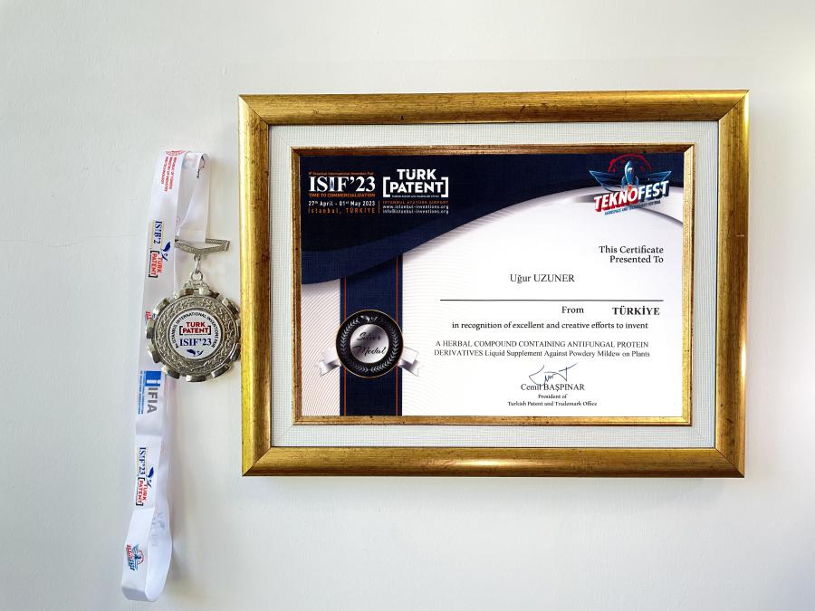 “A Herbal Compound Containing Antifungal Protein Derivatives Liquid Supplement Against Powdery Mildew On Plants (Antifungal Protein Türevleri İçeren Bitkisel Bileşik Bitkilerde Külleme Hastalığna Karşı Sıvı Takviyesi)” başlıklı projesi ile Dr. Öğr. Üyesi Uğur UZUNER,