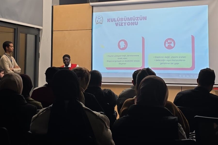 Üniversitemiz Münazara Kulübü, Dünya Arapça Günü kapsamında uluslararası öğrencilerin katılımıyla ilk etkinliğini gerçekleştirdi. Dış İlişkiler Genel Koordinatörlüğü etkinlik salonunda düzenlenen program, farklı kültürlerden öğrencileri ortak bir dil ve kültür zemini etrafında bir araya getirdi. Etkinlikte Arapça; kültürel, düşünsel ve akademik boyutlarıyla ele alınırken, katılımcılara dilin tarihsel derinliği ve medeniyetler üzerindeki etkisine ilişkin nitelikli paylaşımlar sunuldu. Münazara Kulübü’nün ilk faaliyeti olma özelliğini taşıyan program, katılımcıların yoğun ilgisi ve etkileşimiyle verimli ve anlamlı bir atmosferde tamamlandı.