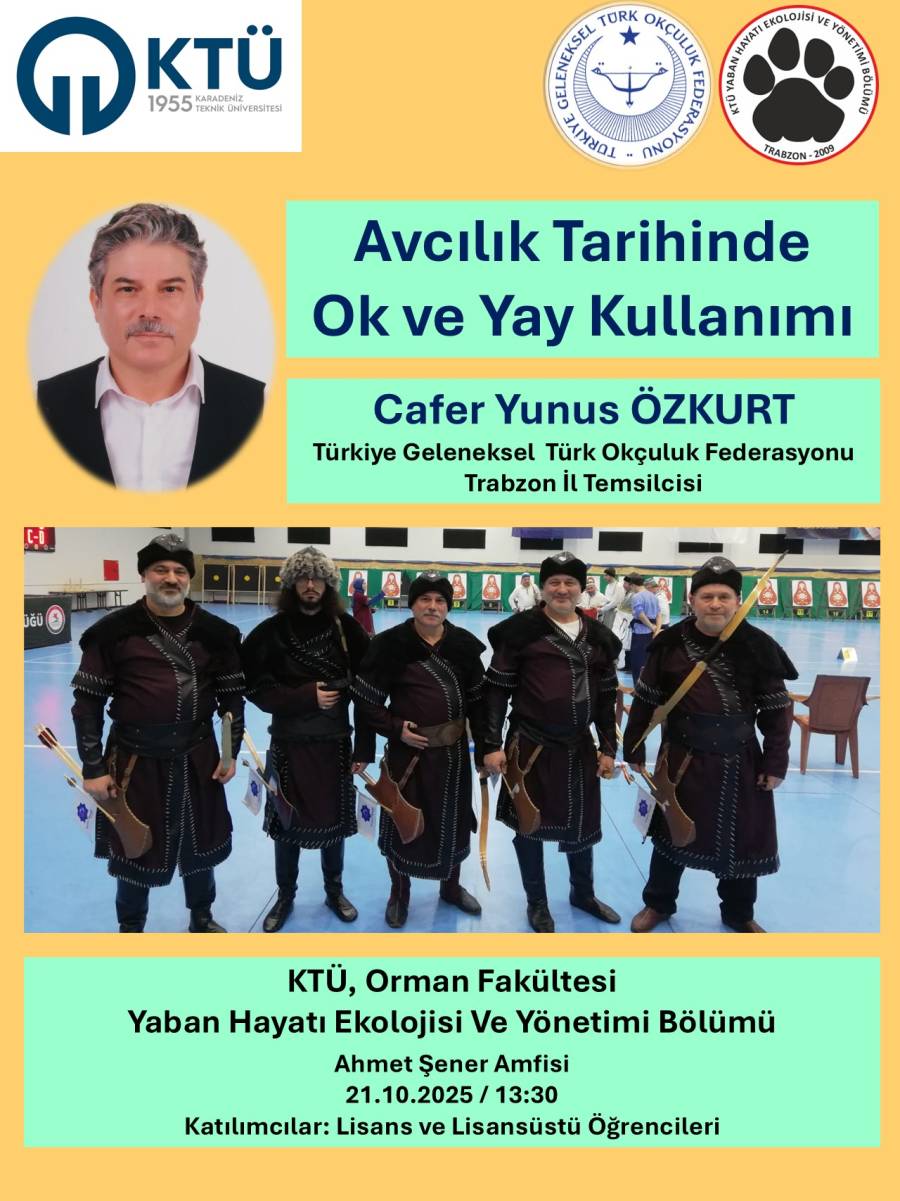 Bölümümüz tarafından, Lisans ve Lisansüstü öğrencilerine yönelik, 21.10.2023 tarihinde, saat 13.30'da, Ahmet Şener Amfisi'nde, Türkiye Geleneksel Türk Okçuluk Federayonu, Trabzon İl Temsilcisi Cafer Yunus ÖZKURT'un konuşmacı olduğu, "Avcılık Tarihinde Ok ve Yay Kullanımı" konulu seminer düzenlenecektir.