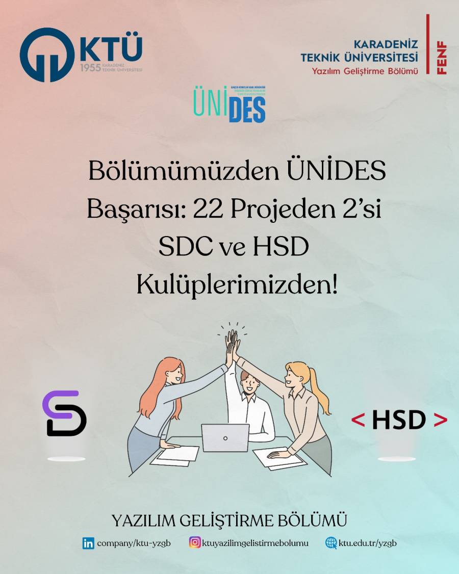 Toplamda üniversitemizden 22 projenin kabul edildiği ÜNİDES projeleri arasında, bölümümüz kulüplerinden iki projenin yer alması öğrencilerimizin yenilikçi fikirlerini ve yazılım alanındaki yetkinliklerini bir kez daha ortaya koyuyor. SDC kulübümüzün geliştirdiği "Geleceğin Yazılımcıları" projesi, öğrencilerin yazılım geliştirme becerilerini geliştirmelerine ve uygulamalı deneyim kazanmalarına odaklanıyor. HSD kulübümüzün "Harmony Tech Summit" projesi ise teknoloji ve yazılım dünyasında genç yeteneklerin bir araya gelmesini hedefliyor.